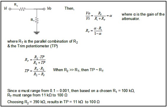 Electrode was held in placed against the contacts on the other side using the elastic band. The attenuator was required since the dynamic analyzer and function generator cannot output a small enough signal to enable the testing of the highest gain 10k on the amplifier, since the output range is limited to ±5V (to be safe ±4V). Single-ended to differential conversion was required as the electrode makes a differential measurement. The above circuit for the conversion was taken from the Burr-Brown Data Sheets for the DRV1100, which can be found on page 6 here (source: http://focus.ti.com/lit/ds/symlink/). The circuit can be modified to allow for resistors to be placed before each of the electrode contacts & the reference electrode. This is necessary to test for a mismatch of inputs. The following describes the equations used to determine the components required for the attenuator circuit: