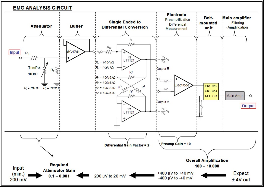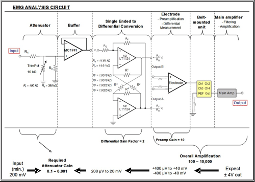 Analysis of EMG systemThe following circuit was designed and built to test the overall Delsys EMG system (electrodes & amplifier):