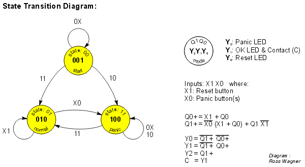 When the module powers-up the machine starts at state 00, in which the panic LED
