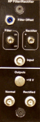 This module is used to condition an EMG signal with a high pass-filter followed by a full-wave rectifier. The high-pass filter is used to reject low-frequency motion artefacts. The rectified output may be selectively inverted. In our lab, the Tibialis Anterior EMG is positively rectified, whereas the Gastrocnemius EMG is negatively rectified. (The 15-volt output once available to power an EMG pre-amplifier has been discontinued in this module. The output signal from the EMG amplifier is applied to the input BNC connector on the front panel. If the signal is to be high-pass filtered only, the output should be connected to the NORMAL output BNC and the filter switch placed to ON. If the input is to be rectified only, the ouput has to be connected to the RECTIFIER output BNC and the filter switch must be set to OFF. The rectifier switch can be set to positive or negative rectification. If the output is to be rectified and filtered, the output has to connected to the RECTIFIED output BNC with the filter switch ON. You may also have an output of 15V at the 15V output BNC which can be used to power the EMG amplifier. The following table summarized the possible outputs: