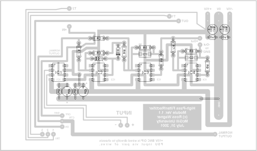 Description of rectifier circuitR1, R3, D1, D2 and IC2 form an inverting, half-wave precision rectifier with positive-polarity selection. The circuit operates by providing two gains. For a positive input, D1 is reversed biased and D2 is forward biased; resulting in a gain of -R3/R1 = -1. For an input with negative polarity, D1 is forward biased and D2 reversed biased; resulting in a gain of 0/R1 = 0. R2, R4, R5 and IC3 form an summing amplifier with differing gains along each input branch. A signal travelling along branch R2 is amplified with a gain of -R5/R2 = -1, whereas a signal travelling along branch R4 is amplified with a gain of -R5/R4 = -2. IC2 and IC3 together form a non-inverting, full-wave precision rectifier. The circuit operates by adding the raw signal provided by SW1 to twice the output of IC2, and inverting it. As such, positive portions of a signal, say, x are processed as follows: -(x + 2(-x)) = x. Negative portions of the signal, on the other hand, are processed as follows: -(x + 2(0*x)) = |x|. Hence, the output of IC3 is always positive. R7, R8 and IC4 form an inverting amplifier with negative unity gain. It is used to provide an inverted rectified output via SW2. C1, R6, C2 and R9 compensate their respective OpAmps so that large capacitive loads may be driven (e.g, long cables). This form of compensation does not reduce phase margin but may only be used on OpAmps that are stable at unity gain. Printed Circuit Board |