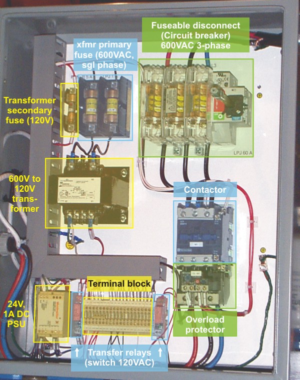 The cable going to the Operator Interface Panel may be seen coming into the box from the bottom. Below is a close-up view of the internals of the box, highlighting various sections. See this wiring diagram in PDF format.