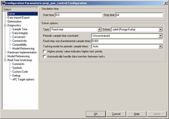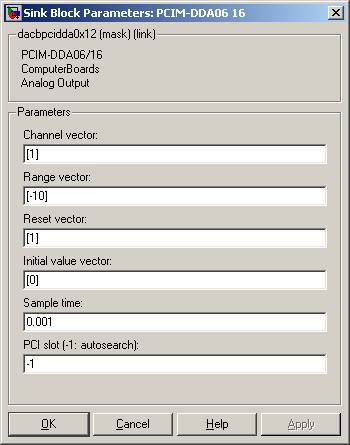 The completed block diagram, shown below, performs the control law: 8*(Desired Position - Actual Position - Initial Position) The Sum, Gain and Constant blocks are standard Simulink blocks. From the DSP Blockset, a Sample & Hold and 2 delayed Switches are used to store the initial position. Link to model file: Proportional Position Controller The I/O block parameters are shown in the figures below. TIP: Pay particular attention to the sample time and the range values. The sample time should match the desired sampling frequency. In this case, it is set to 1 kHz. The PCIM-DAS 1602/16 has been set up to run 8 differential channels, whereas the block default sets it to 16 single-ended channels.!