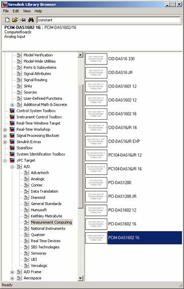 Build a Simulink Block DiagramSimulink Block DiagramThe first step in using the xPC system is to develop the code through the use of Simulink and the xPC Library of I/O blocks. The Simulink Block Library on the xPC Host machine (Spastic) includes the xPC library which has special blocks to interface with a variety of I/O boards.