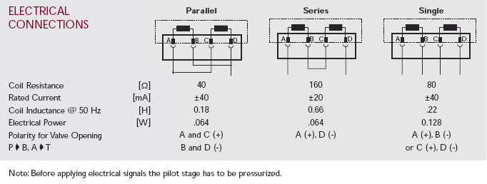 Model: D671-3001 (Moog) The amount by which the spool is open is directly related to the speed of the actuator rotation. In principle, when the spool is at center position the actuator will not rotate since all fluid ports are blocked. (In practice the servovale null may have to be adjusted to achieve zero actuator motion.) Wiring InformationThe servovalve is equipped with a four-pin electrical box connector that mates with an MS3106F14S2S cable connector. All four torque motor leads are available at the connector so external connections can be made for series, parallel or single coil operation. See illustration below.