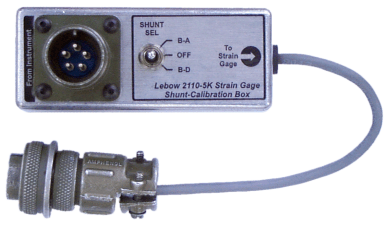 ProcedureOne means of calibrating the strain gage conditioner module + torque transducer combination is to attach the transducer to the module then shunt one leg of the strain gage bridge with a known precision calibration resistor. This produces an electrical signal at the bridge output that is equivalent to an applied torque. The calibration box shown below facilitates this task. The transducer is attached to the connector on the box and the cable emanating from the box is attached to the strain gage conditioner module. The box incorporates a shunt resistor and a switch that allows the user to selectively shunt legs B-A or B-D of the torque transducer bridge or remove the shunt altogether (OFF.)