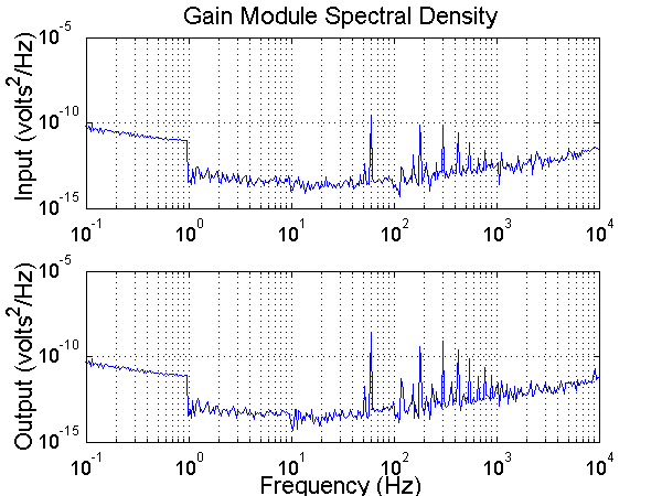 Frequency responseThe frequency response shows that for gains from 0.01 to 10 the gain response is quite flat. There is a small roll-off at 50 000 Hz at a gain setting of 100. At a gain setting of 1000 the roll-off is much steeper and begins at 5 000 Hz. The phase shift is flat at 0 degrees for all gain settings.