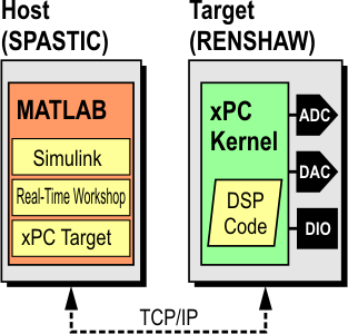 xPC (Experimental Control)What is xPC Target?xPC Target is a Matlab-based real-time digital signal processing (DSP) system. It allows you to develop DSP code as a Simulink block diagram and run it in real-time on standard PC hardware equipped with I/O boards. xPC uses a host-target structure, with the host PC running Matlab/Simulink, and the target PC running a real-time kernel. The host PC builds and loads the DSP code onto the target PC via TCP/IP, making for quick DSP development.